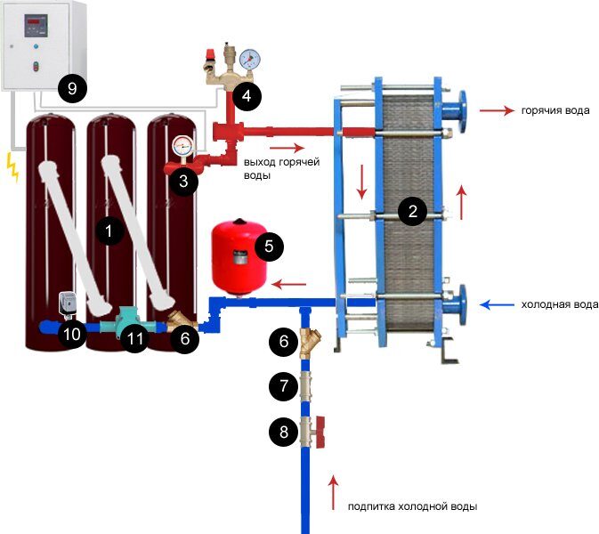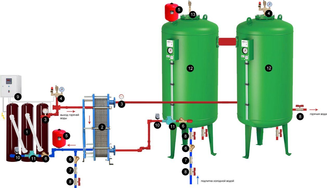 для получения ГВС с подключением к стандартным и нестандартным емкостям потребителя. Объем накопительной емкости к модулю подбирает заказчик исходя из потребностей для создания запаса горячей воды на период «пиковых» потреблений в течение суток.